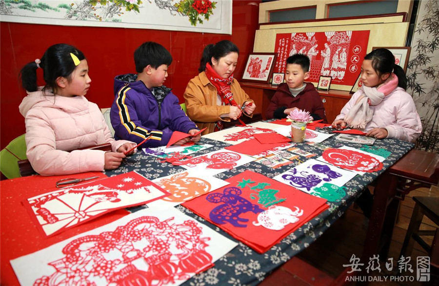 2021年1月7日,在安徽省桐城市的一家剪纸工作室,市级非遗项目桐城剪纸的传承人薛海霞(中)在指导孩子们剪纸。当日,安徽省桐城市北街小学以传承非遗文化为理念,把非遗传承与学校社团活动有机结合,让学生们在社团活动中体验剪纸技艺、参观剪纸作品、感受剪纸文化的魅力。通讯员 江胜 潘月琴 摄
