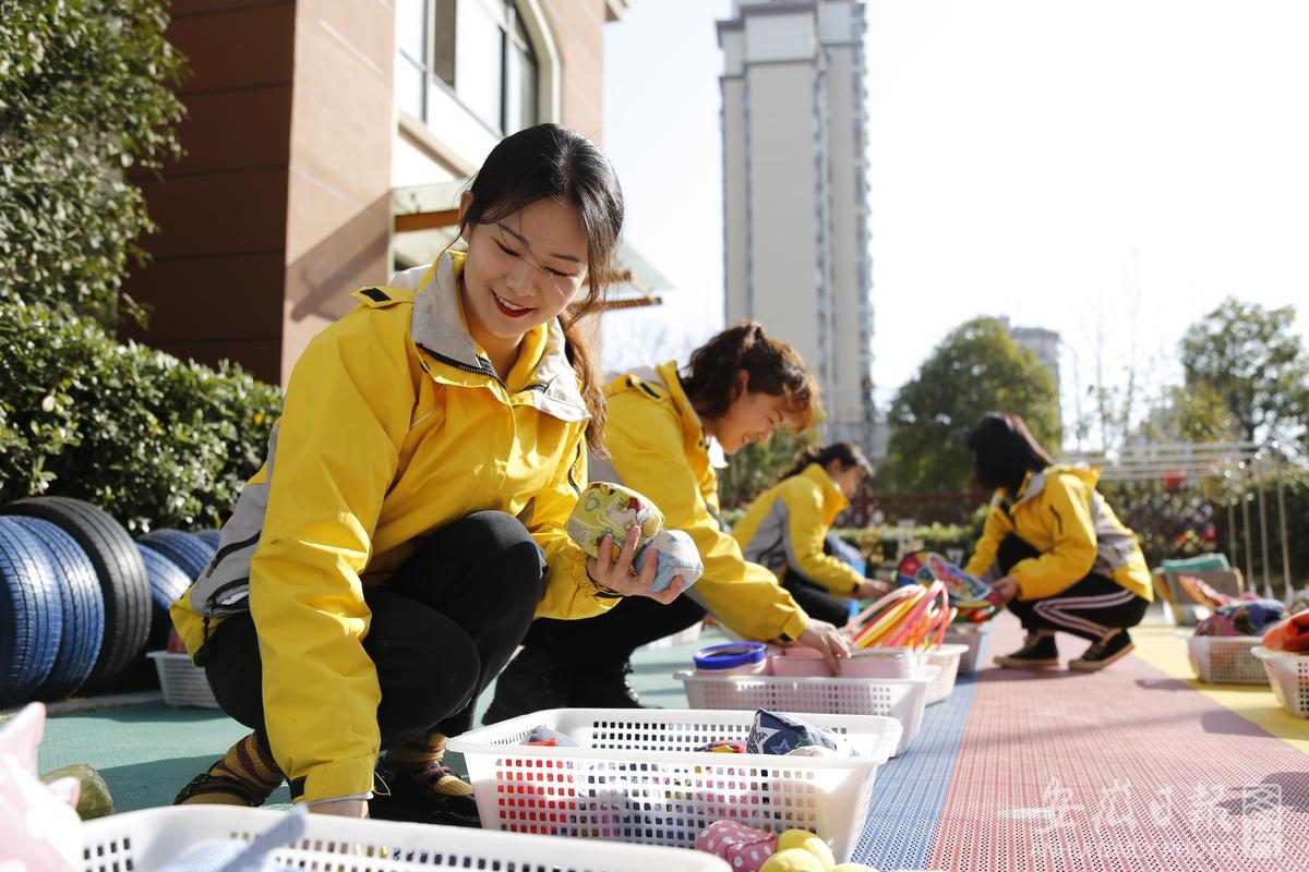 2月19日,合肥市琥珀名城和园幼儿园的老师将园内玩具整理、归类、晾晒。当日,该园老师集中打扫卫生和布置教室,迎接新学期归园的幼童。通讯员 吴海波 摄