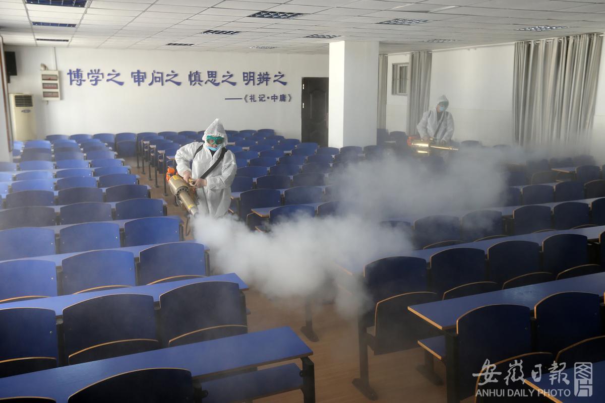 2月19日,淮北市第三实验小学的工作人员在校园进行消杀作业。连日来,该市各中小学组织人员开展校园全面消杀作业,为新学期开学做好准备。通讯员 万善朝 摄
