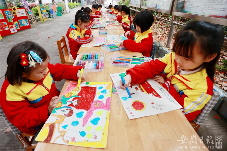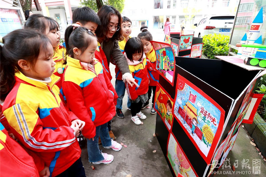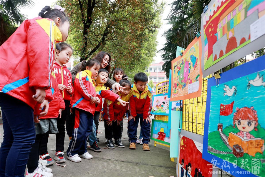 4月2日,当涂县团结街小学附属幼儿园的老师领着孩子参观画展。 当天,该幼儿园举办以《放飞中国梦 传承红基因》为主题的幼儿画展。共展出幼儿绘画作品近百幅。小班的孩子还在老师的指导下现场作画。党是阳光我是苗,孩子们用稚嫩的小手握着七彩画笔,在洁白的画纸上描绘出心目中伟大祖国的形象,画出了对党、对人民、对祖国的浓浓爱意和美好祝福。 活动不仅让幼儿体验到了绘画的快乐,也在幼小的心灵中传承了红色基因,使孩子们对党、对祖国有了更深刻的认识和感受。(通讯员 汪宗本 摄)