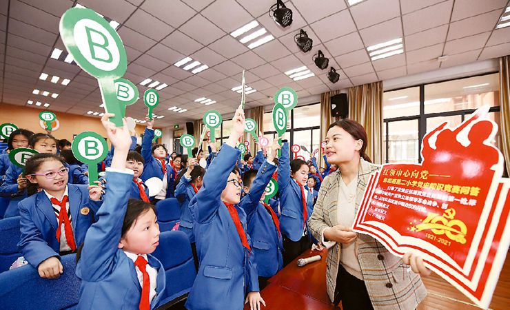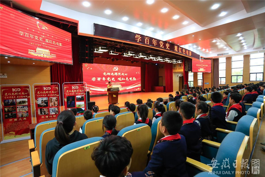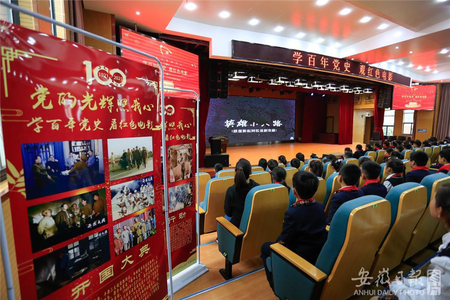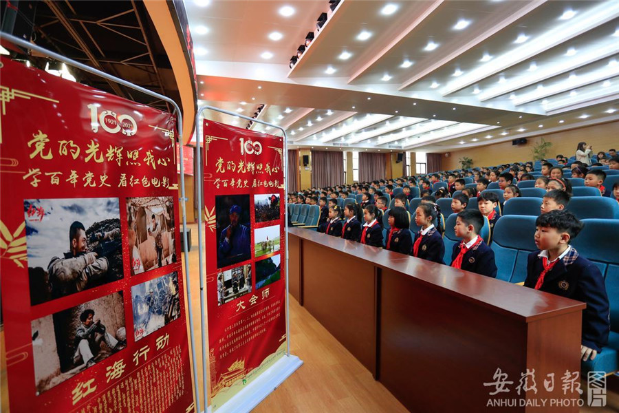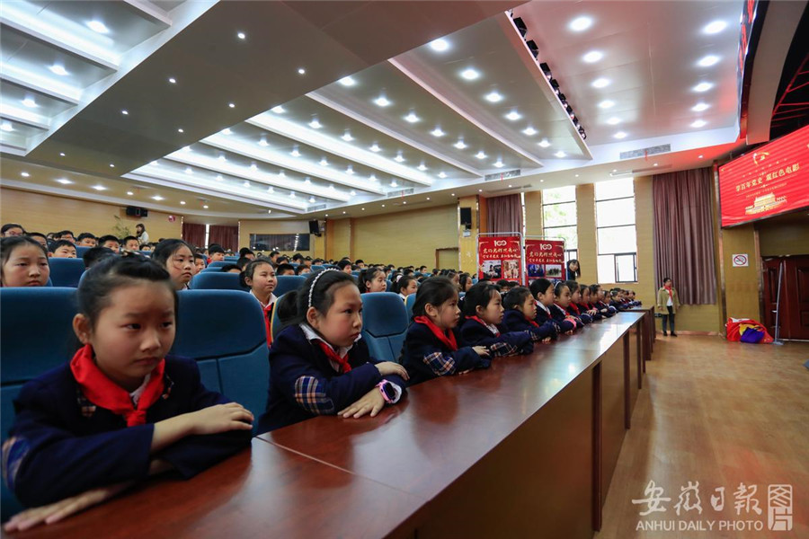 4月12日,合肥市安庆路第三小学灵溪校区200名小学生正在学术报告厅聚精会神地观看电影《英雄小八路》。为进一步做好辖区中小学党史学习教育工作,合肥市庐阳区林店街道官塘社区妇联、关工委组织开展“红色电影进校园”主题活动,弘扬爱国主义精神,让小学生牢记历史,缅怀革命先驱,珍惜当今幸福生活,努力做红色基因的传承者。通讯员 赵明 摄