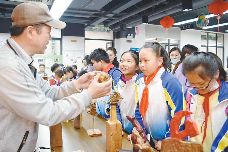 4月20日,在合肥市青秀城悦书房,蜀山区五里墩街道清溪路社区邀请的非遗传承人走进社区,组织学生体验民间传统技艺,感受传统非遗文化的魅力。温沁 摄