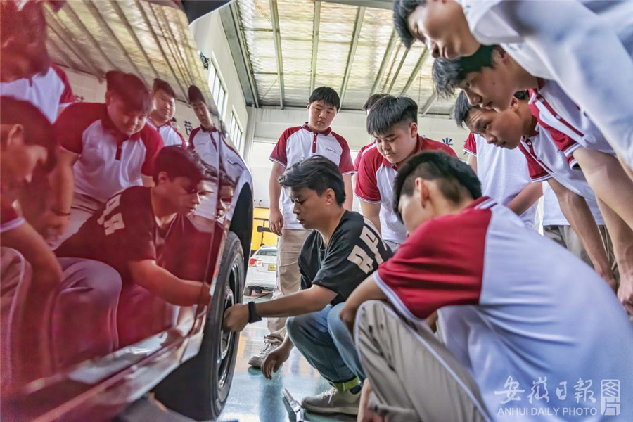 5月10日,合肥市肥东县合肥理工学校汽车实训中心内,学生们在上汽修实训课。该校将理论学习、技能培养、校内实训、校外实习融合,推进教产合作,校企一体化共同制订人才培养方案,先后与海尔、合力叉车、安徽风之星、红黄蓝等86家单位开展合作,实现学校、学生、企业三方共赢。记者 杨竹 通讯员 阮雪枫 摄
