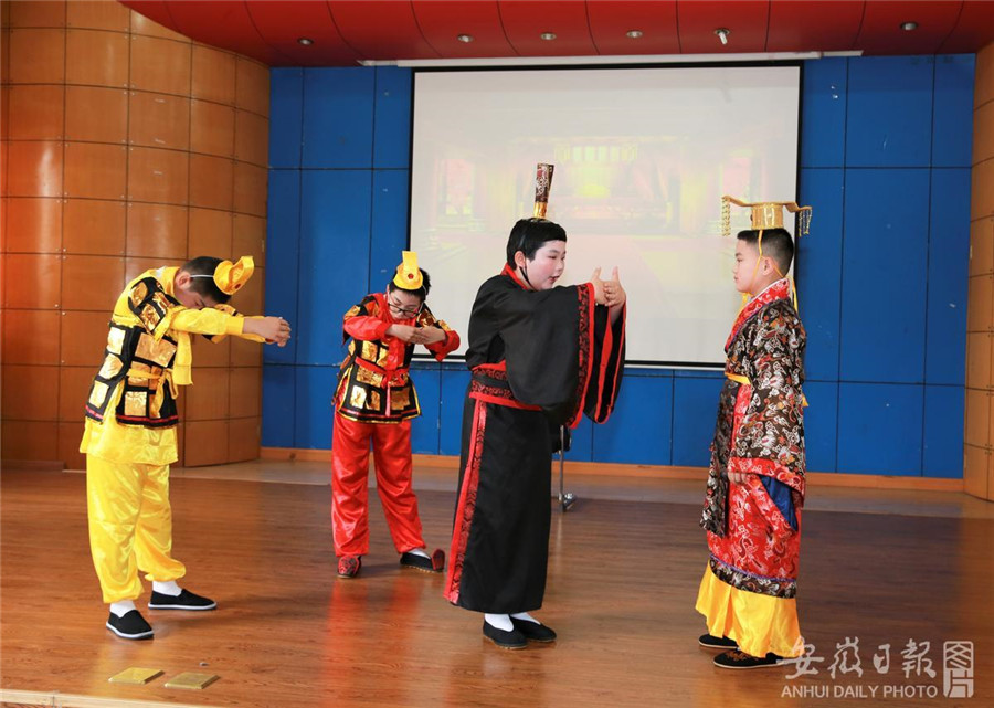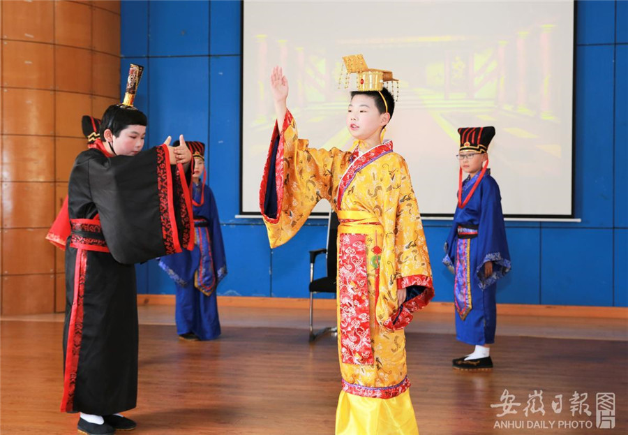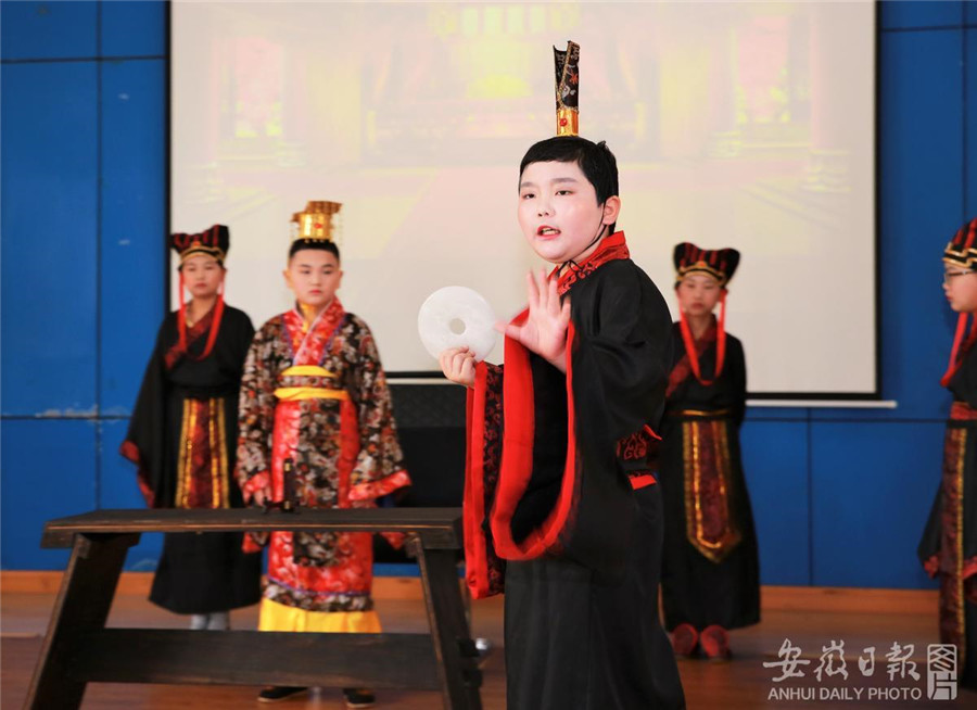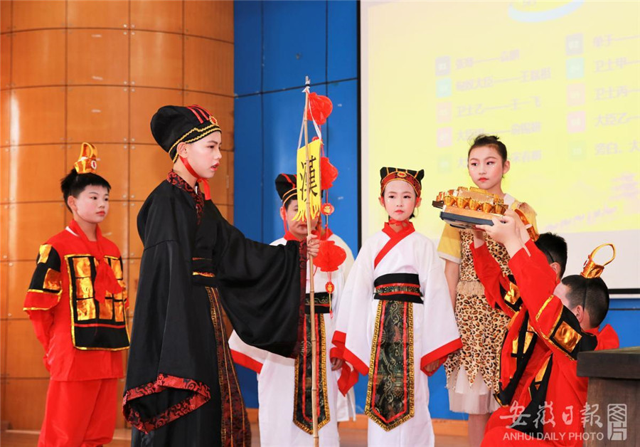 5月20日,在铜陵市田家炳小学古诗文诵读会上,孩子们正在表演历史剧《张骞出使西域》。为激发孩子们学习经典古诗文的兴趣,该校积极鼓励学生通过自编自导自演舞台剧,将不同朝代的诗、文、历史故事串联在一起,让学生们在寓教于乐的氛围中接受中华传统美德和优秀文化的熏陶,重温历史经典,提升文化内涵。通讯员 潘伟 摄
