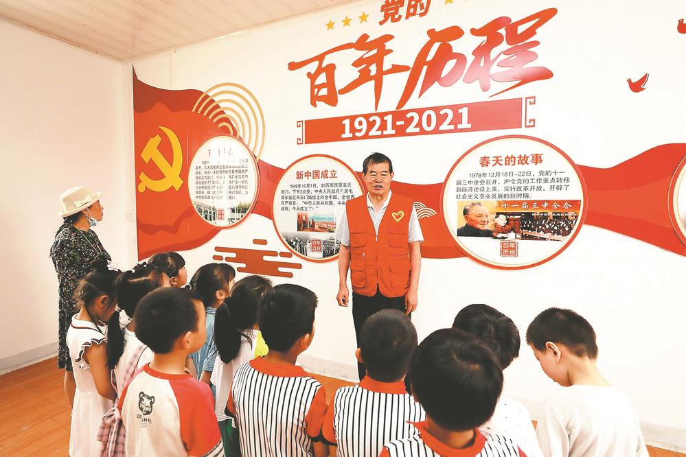 日前,在全椒县二郎口镇下陶村大胡组新时代文明实践点微型党史学习馆,志愿者在给前来参观的村民和孩子们讲述曾经发生在当地的革命故事,让他们接受党史学习教育,激发爱国情感。