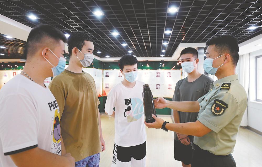 近日,合肥市蜀山区琥珀街道人武部联合北苑村社区党委,组织辖区预征青年走进安徽省军区合肥第二离职干部休养所,通过参观荣誉室、生活区,学党史、学军史、学内务,接受革命传统教育,坚定理想信念。图为预征青年了解炮弹壳背后的故事。通讯员 陈三虎 摄