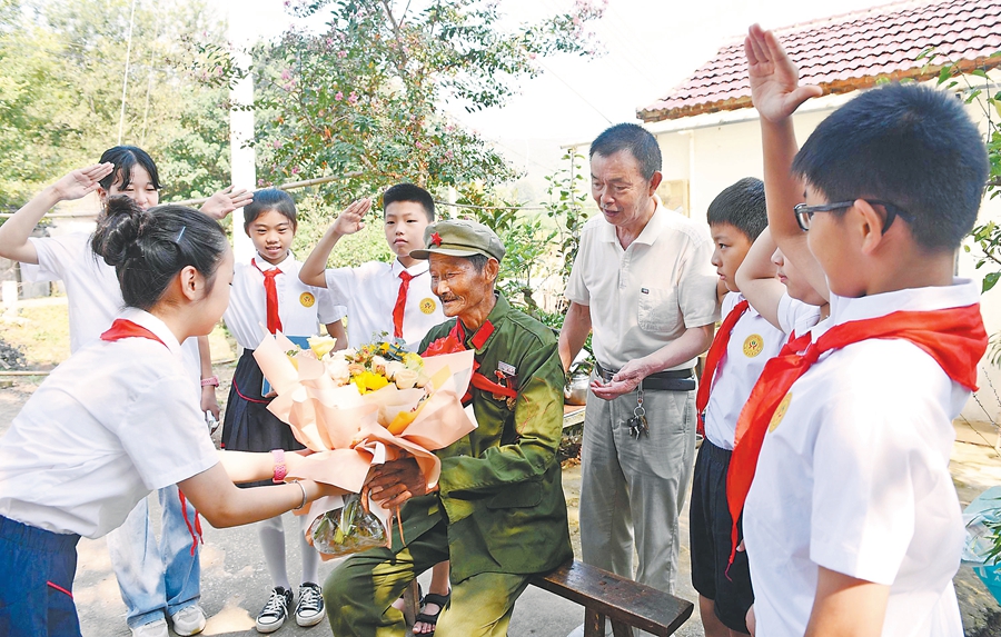 8月31日,含山县环峰小学学生和新时代文明实践中心等单位的志愿者们走进陶厂镇卜李村,聆听97岁的抗战老兵沈永道讲述革命故事,接受爱国主义教育。