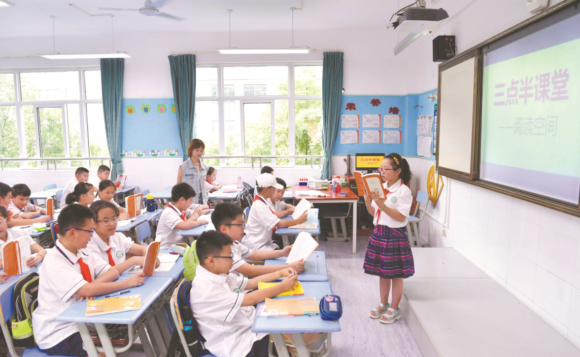 9月1日,合肥市包河区华山路小学普惠托管课堂上,五年级学生在老师带领下进行课后阅读。包河区57所学校落实“三点半课后服务”,采取“普惠托管+个性化课程”模式,落实“双减”政策。记者 程兆 摄