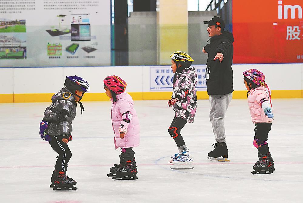 12月25日,合肥市包河区包公街道芜湖东路社区组织辖区青少年在安徽五环冰雪馆体验冰上项目。该场馆是我省首个综合类室内冰雪运动馆,近日已向市民开放。场馆内设有冰球、冰壶、花样滑冰等体验项目。北京冬奥会即将开幕,市民对冰上项目热情日益升温。 记者 杨竹 摄