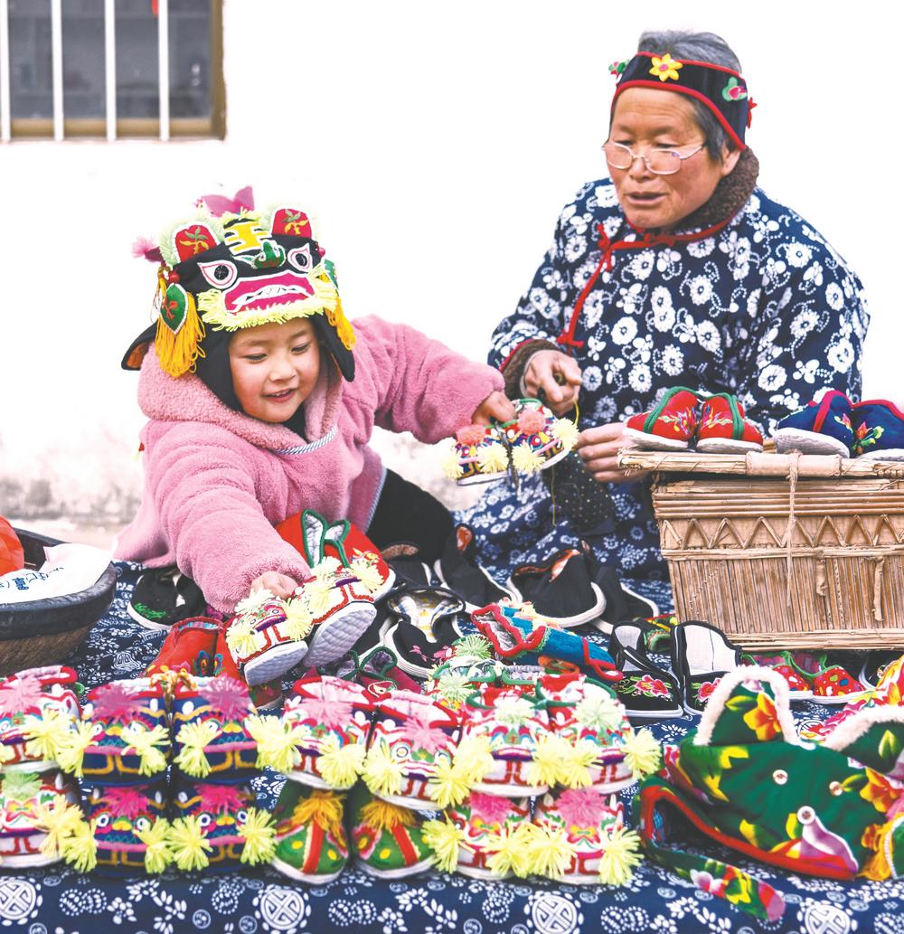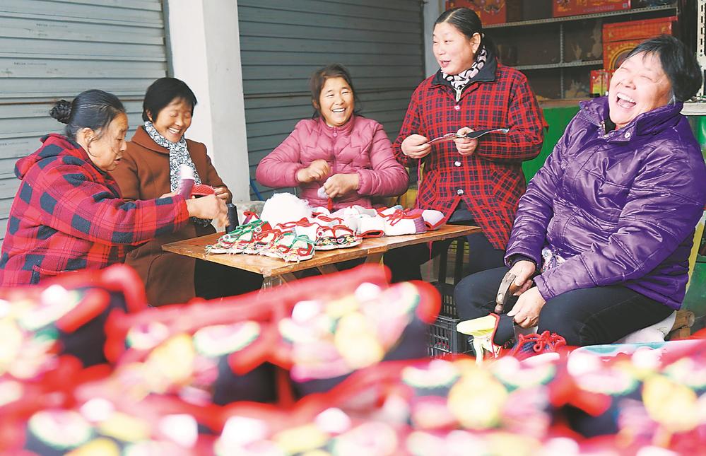 怀宁县洪铺镇正街,几名村民团坐在一起制作具有平安吉祥寓意的虎头鞋。 本报通讯员 檀志扬 赵林玉 摄