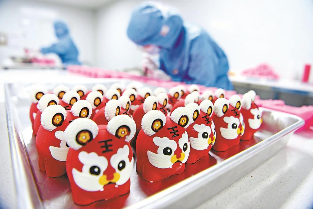 虎年春节到来前,淮南市八公山区工业集聚区内,专业生产巧克力制品的安徽京创食品有限公司根据客户订单需求,设计生产各种生肖“虎”巧克力蛋糕装饰物,满足国内外市场需求。特约摄影 陈彬 摄