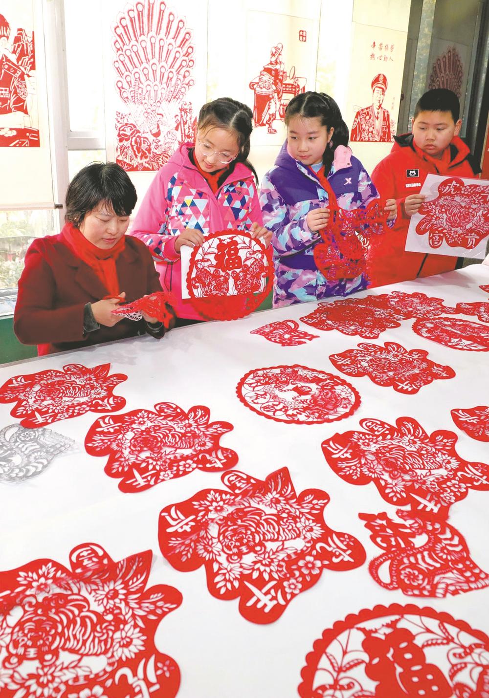 桐城市小学生在剪纸非遗传承人指导下学习生肖“虎”主题剪纸制作,感受传统文化魅力。本报通讯员 江胜 摄