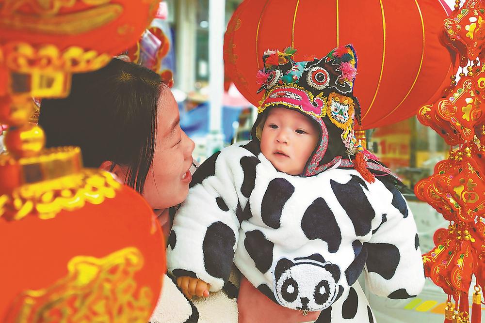 1月27日,在亳州市谯城区牛集镇牛集大街,一村民抱着戴虎头帽的宝宝购买饰品,装点家室,欢欢喜喜迎虎年。本报通讯员 武清海 摄
