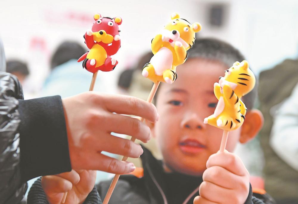 辞旧迎新之际,以“虎”为主题的活动火热登场,以“虎”为元素的装饰琳琅满目。五颜六色、形式各异的虎头帽、虎头鞋、福虎剪纸、面塑玩具……营造着浓郁的喜庆气氛,满载着人们对幸福生活的美好祝愿。