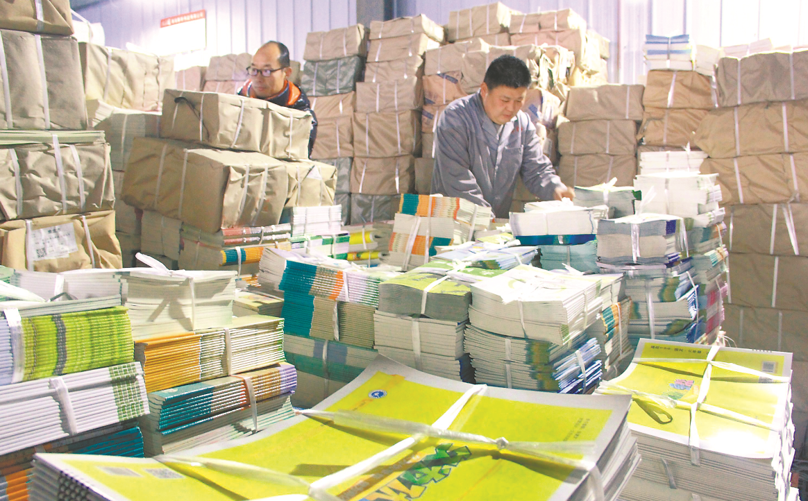 2月7日,淮北市新华书店工作人员在对全市183所中小学新教材进行整理、分拣、打包、配送。新学期,该市预计发行教材教辅198万册。