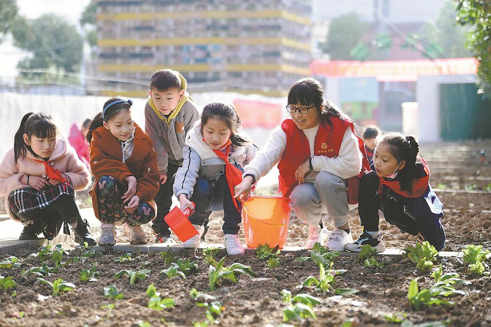 3月8日,合肥和平小学花冲分校学生在社区志愿老师指导下种菜。近年来,该校在校园开辟600平方米的劳动实践基地,开设第二课堂,并联合七里站街道东七社区,聘请社区志愿老师,指导孩子们参加劳动。 通讯员 蒋娟娟 摄