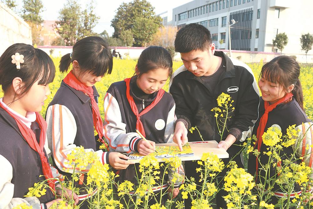 3月11日,在阜南县三强村一处油菜花田里,该县第十六小学开展“亲近自然,描绘春天”主题活动,美术老师冯相超指导学生写生。 通讯员 田鋆生 摄