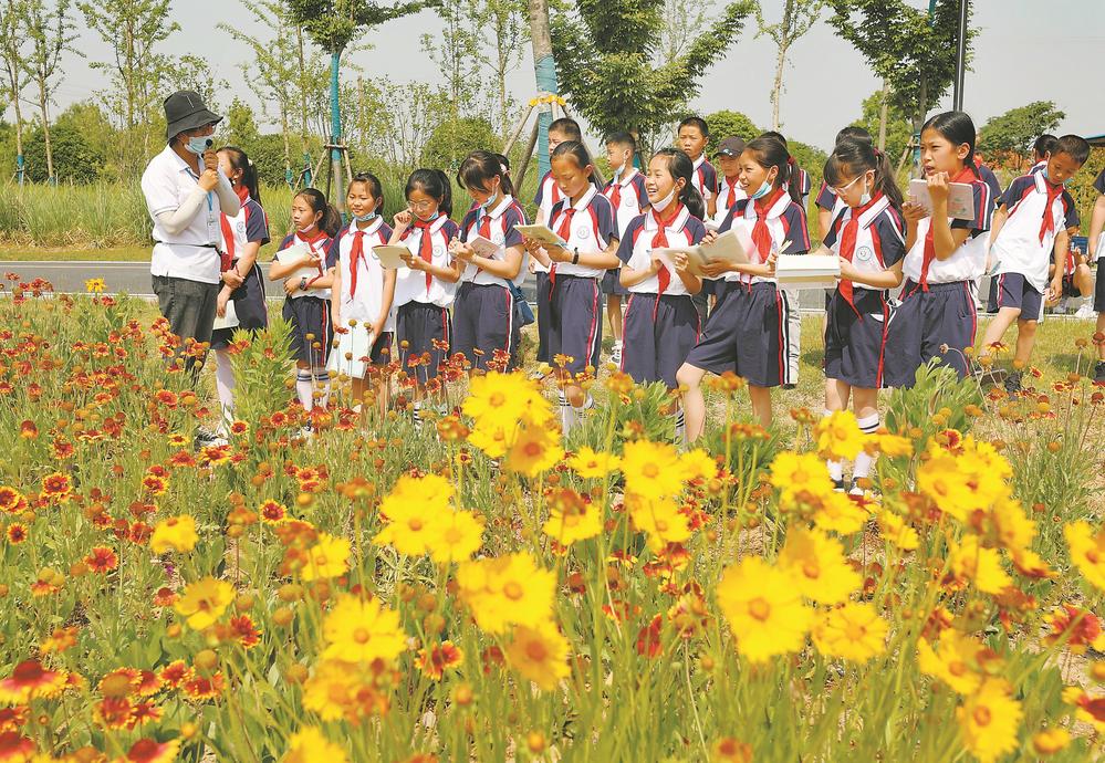5月23日,在肥东县梁园镇管湾国家湿地公园,工作人员向小学生讲解湿地植物分布知识。当日,团肥东县委与梁园学区中心学校联合开展“走进湿地 保护环境”校外实践活动,增强孩子们的环境保护意识。