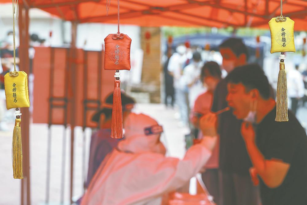 6月5日,合肥市蜀山区西园街道为考生进行免费核酸检测。高考临近,该街道为考生开辟免费核酸检测绿色通道,并送上祝福。 记者 范柏文 摄
