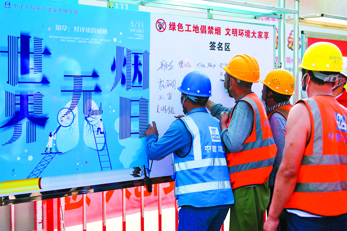 5月30日,中建五局二公司、合肥市包河区文明办在辖区项目工地联合开展“绿色工地倡禁烟 文明环境大家享”宣传活动,倡导健康文明生活方式。记者 李博 通讯员 余雷 摄
