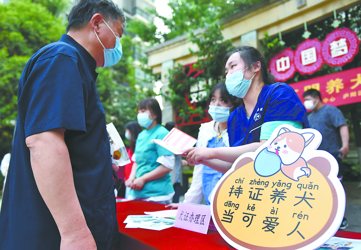 5月26日,合肥市庐阳区新时代文明实践中心开展文明养犬宣传进社区活动。图为劝导员在庐阳区杏花村街道金都华庭小区向居民介绍文明养犬知识。通讯员 葛传红 万冬平 摄