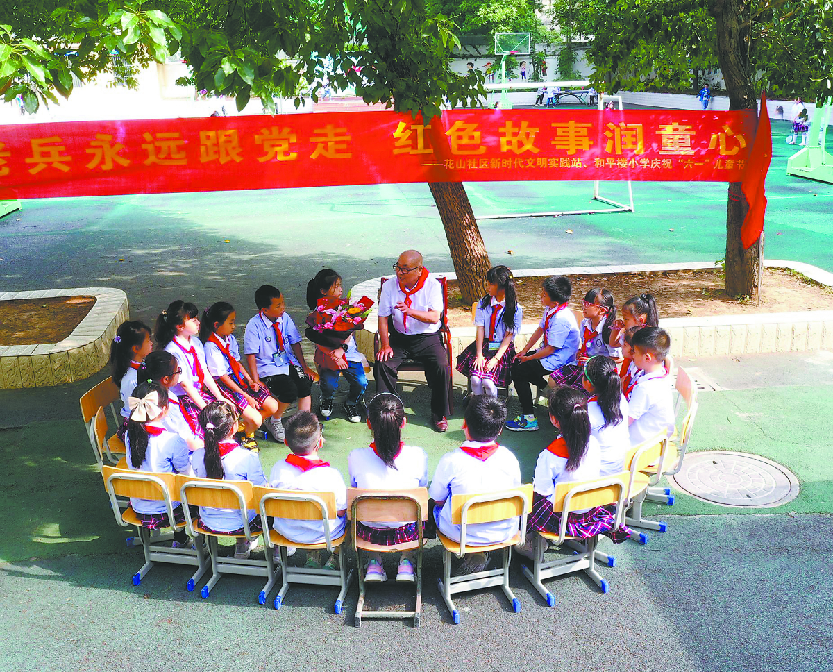 日前,马鞍山市花山社区新时代文明实践站联合和平楼小学开展“老兵永远跟党走 红色故事润童心”活动,邀请79岁党员、抗美援朝老战士陈光荣讲革命故事,培养孩子们的爱国情怀。通讯员 陈亚东 叶丽华 摄