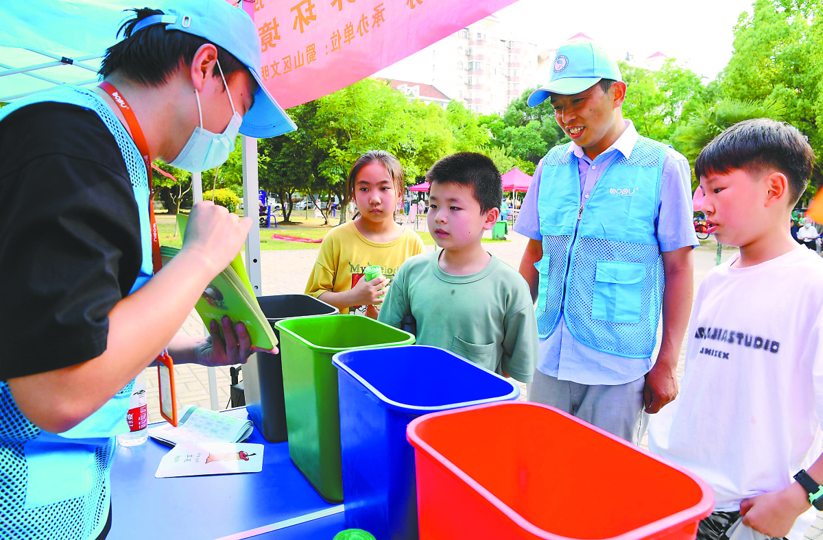 6月1日,合肥市蜀山区琥珀潭社区工作者向居民介绍垃圾分类知识,倡导居民从自身做起,共同打造文明美丽家园。通讯员 陈三虎 摄