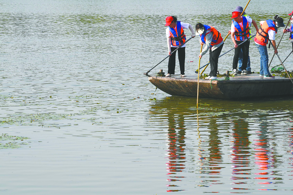 6月1日,在涡河亳州市区段,谯城区 “护卫母亲河 天蓝绿水行”志愿服务项目的20余名志愿者在清理水草。该服务项目从2009年开始实施,先后荣获全国学雷锋志愿服务“四个100”项目先进典型、“中国百个优秀青年志愿服务集体”等称号。特约摄影 张延林 摄