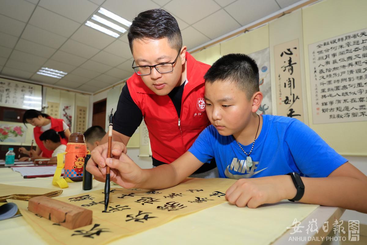 7月13日,在合肥庐阳经济开发区金池社区书画室,志愿者正在辅导孩子们练习书法。暑假来临,为解决辖区双职工子女无人看管照顾问题,该社区充分利用社区党群服务中心多功能活动室作用,招募才艺志愿者,为儿童提供为期1个月的学习辅导、书法绘画、科普体验、普法教育等内容,让孩子们度过一个快乐充实的暑假生活。通讯员 赵明 摄