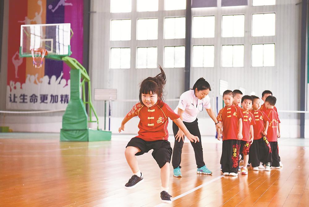 8月3日,在合肥市公安局交警支队综合文体馆内,全市公安机关第五届民警、辅警子女“暑期托管班”在上武术兴趣课。