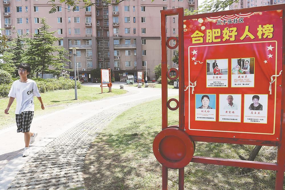 日前,武家豪前往合肥市新站区三十头社区新时代文明实践站,给暑期托管班的孩子们上课。小区里竖立着“合肥好人榜”宣传栏。