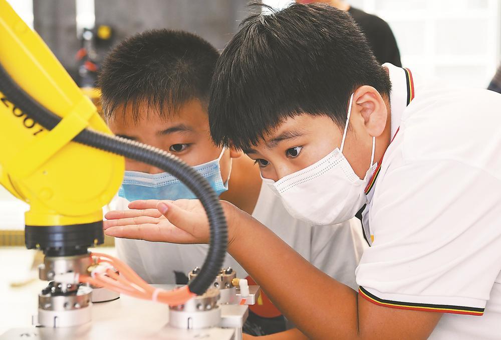 7月27日,合肥市包河区常青街道组织来合肥过暑假的临工子女在蓝博教育科技有限公司体验工业机器人操作,这让程立波(右)大开眼界。