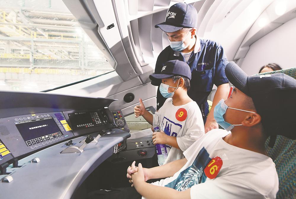 7月27日,孩子们在合肥南站动车运用所学习动车知识。