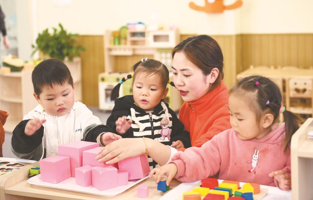 10月27日,来安县三城镇中心幼儿园内,孩子们在老师的陪伴下开心地做游戏。今年以来,该县优化资源配置,多途径满足居民托育需求,今年秋季,新建小区配套园4所、提供学位810个,有效缓解了公办园“入园难”问题。通讯员 吕华 摄