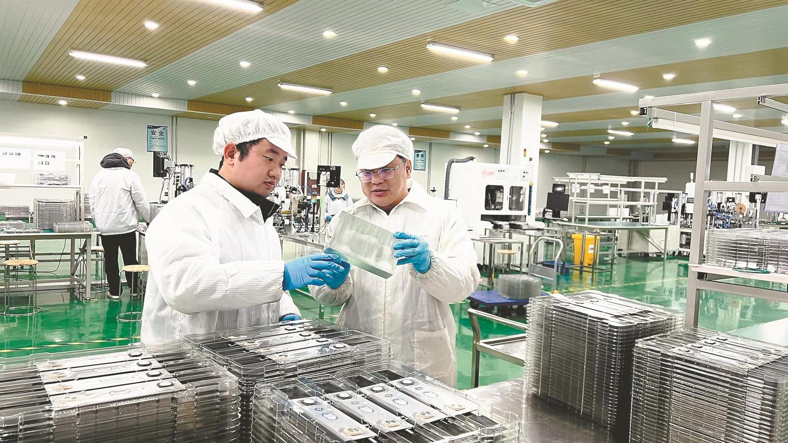 日前,在休宁县芯屏新材料产业园黄山市百思利新能源科技有限公司生产车间,合肥工业大学(休宁)产业技术创新中心主任、博士沈王强(左)与企业技术骨干改良新能源汽车锂电池生产工艺,提升良品率。