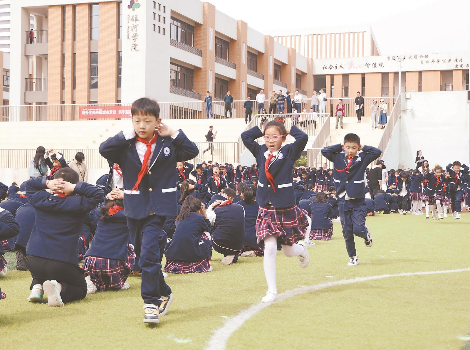 4月18日,合肥市临泉路第一小学的孩子们在参加防震演练。合肥市瑶海区将校园防踩踏、防地震等应急疏散演练活动常态化,切实提高师生的应急避险和自我防护能力。本报通讯员 熊 伟 摄