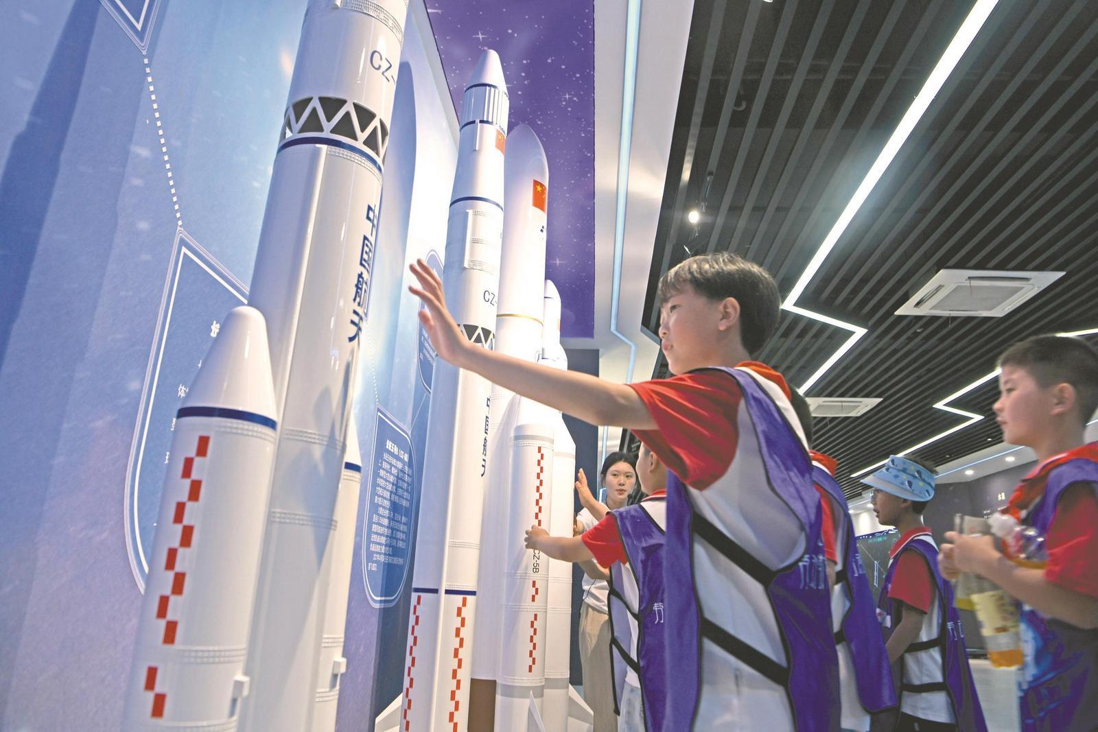 5月20日,凤台县第四实验小学学生走进淮南市水滴空间劳动教育科创基地,学习航天知识。该基地运营一年来,先后有2万余名中小学生到此学习。特约摄影 陈 彬 摄