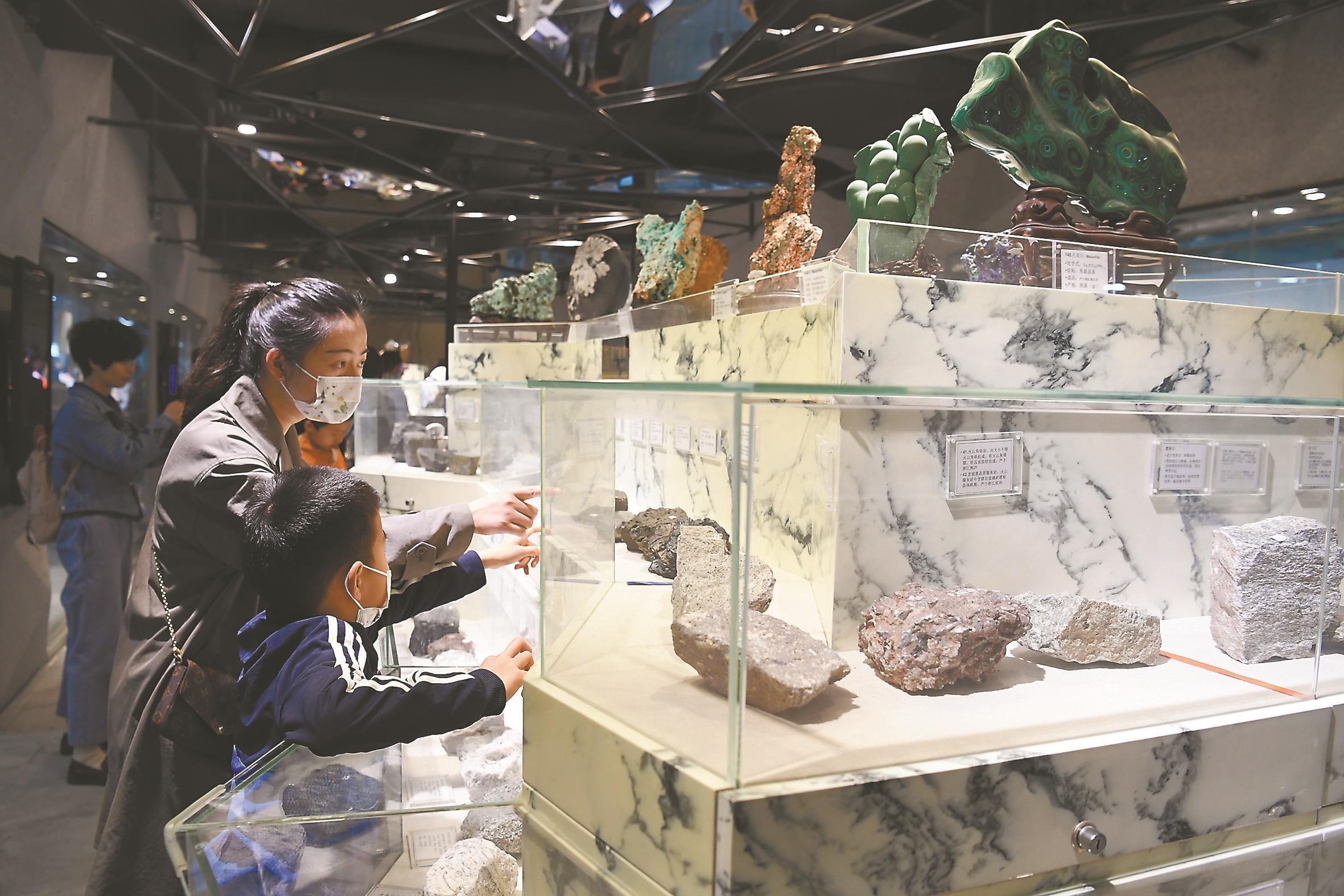 中国科大2023年科技活动周期间,在地球和空间科学科普点,青少年参观地质展馆。
