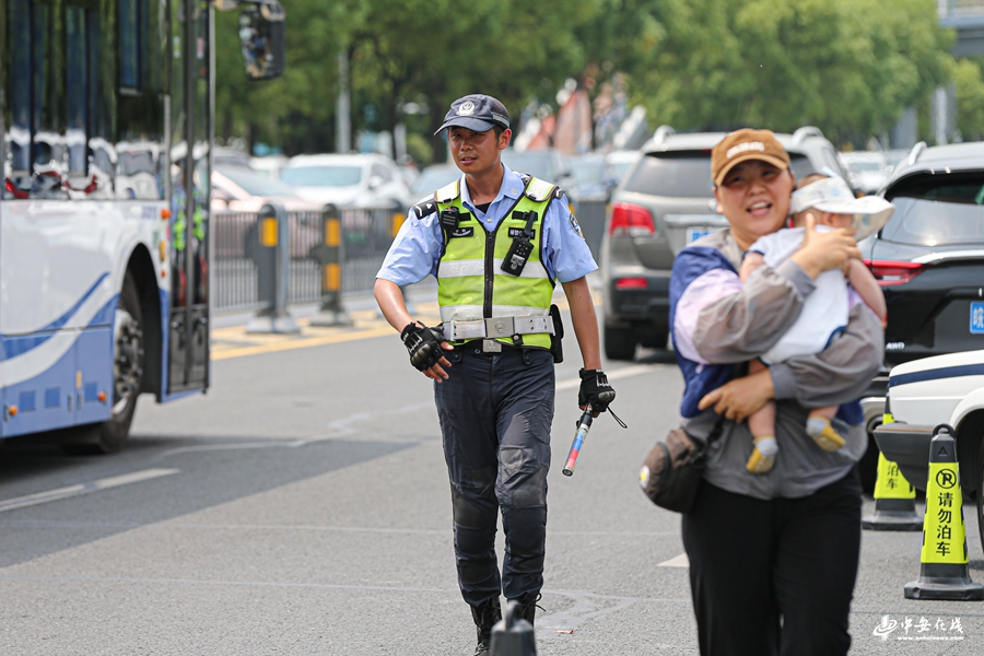 6月15日,2023年安徽中考进入第二天,多地发布高温橙色预警,部分地区最高气温超35℃。在合肥市经开区168中学始信路校区门口,交警部门在考点周边增派警力,加强管控疏导,保障中考期间考点周边道路交通秩序。(汪宜胜 记者 刘玉才)