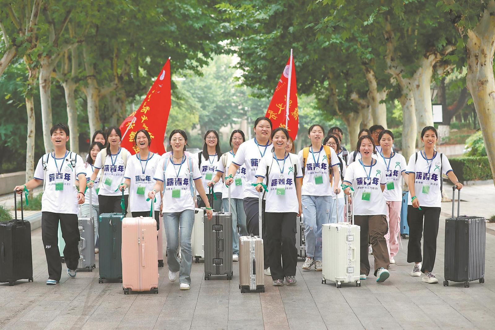 7月9日,淮北师范大学“薪火义务支教社”举行暑期支教出征仪式,24名大学生志愿者分组前往砀山县毛雷庄学校和界首市第三小学开展为期两周的暑期义务支教活动。今年他们将为孩子们带去美工、书法、舞蹈、体育等丰富多彩的兴趣课程。据了解,“薪火义务支教社”是一个公益性学生社团,自2004年4月成立以来,连续20年先后深入新疆、内蒙古、贵州、甘肃等12个省、自治区乡村学校开展暑期支教活动。图为24名志愿者从校园出发。通讯员 万善朝 摄