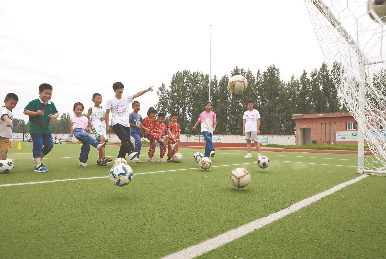 7月16日,在肥西县山南学区中心学校,大学生志愿者和孩子们一起踢足球。暑期伊始,山南镇联合安徽医科大学暑期社会实践团开展陪伴乡村少年的志愿服务活动,丰富孩子暑期生活。通讯员 陈家乐 摄