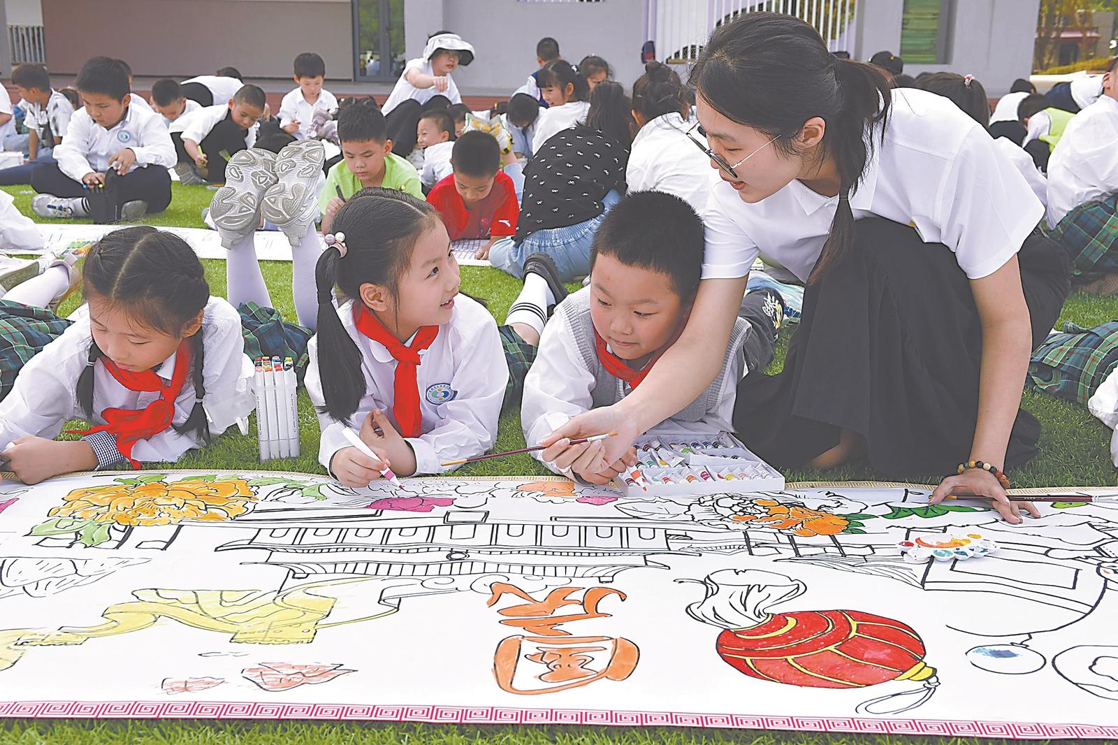 9月25日,合肥市玉镜路小学举办以“爱我中华,百米画卷迎国庆”为主题的爱国同庆活动。孩子们用五彩的画笔,绘出了对生活的热爱,更绘出了对祖国未来的美好憧憬。通讯员 陶声凤 葛宜年 摄