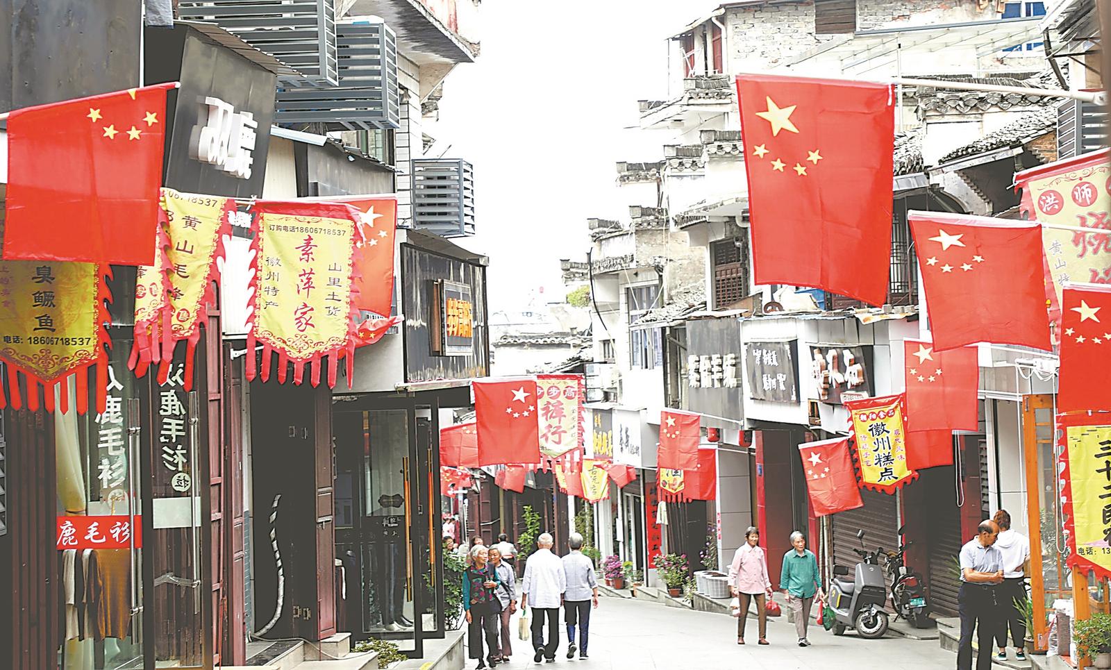 9月24日,歙县徽州古城五星红旗飘扬,处处呈现迎接国庆节的喜庆氛围,市民和游客行走在古城内欣赏美景,打卡拍照。通讯员 吴建平 吴翠花 摄