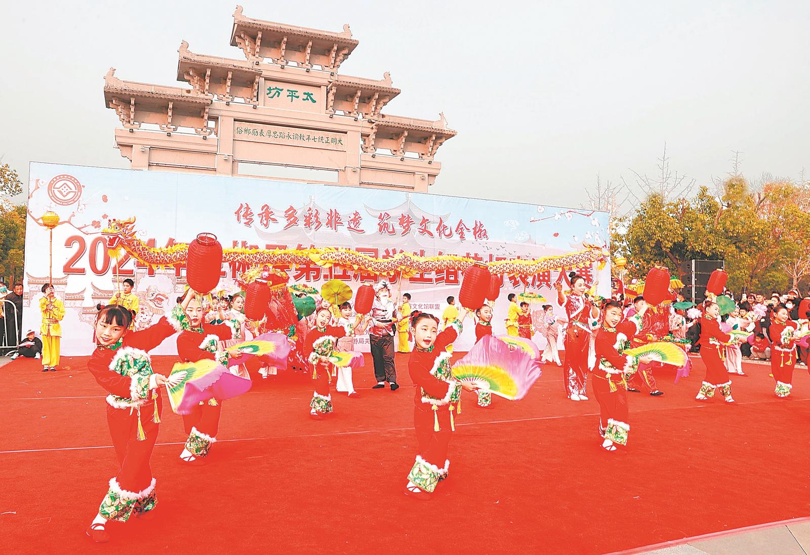 12月7日,全椒县举办第五届学生组花灯表演大赛,共有12支学生代表队参加。比赛包含了舞龙、舞狮、兰花灯、八朵云等多种民间传统花灯表演。图为全椒县江海小学学生在表演《玩花灯》。通讯员 沈果 摄
