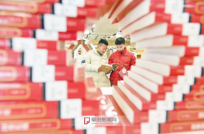 2月6日,在阜阳市图书馆,两名小学生一起阅读图书。
