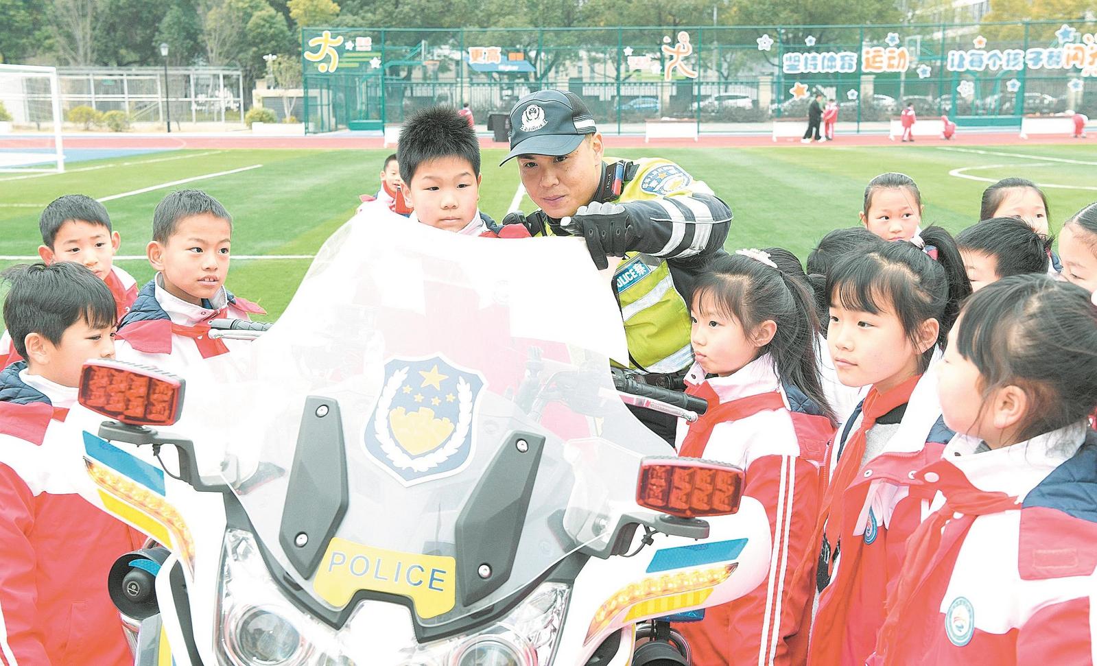2月14日,在合肥市蜀鑫路小学,合肥市公安局交通警察支队蜀山大队走进校园为学生讲解交通安全知识,上好安全“第一课”。通讯员 陈三虎 摄