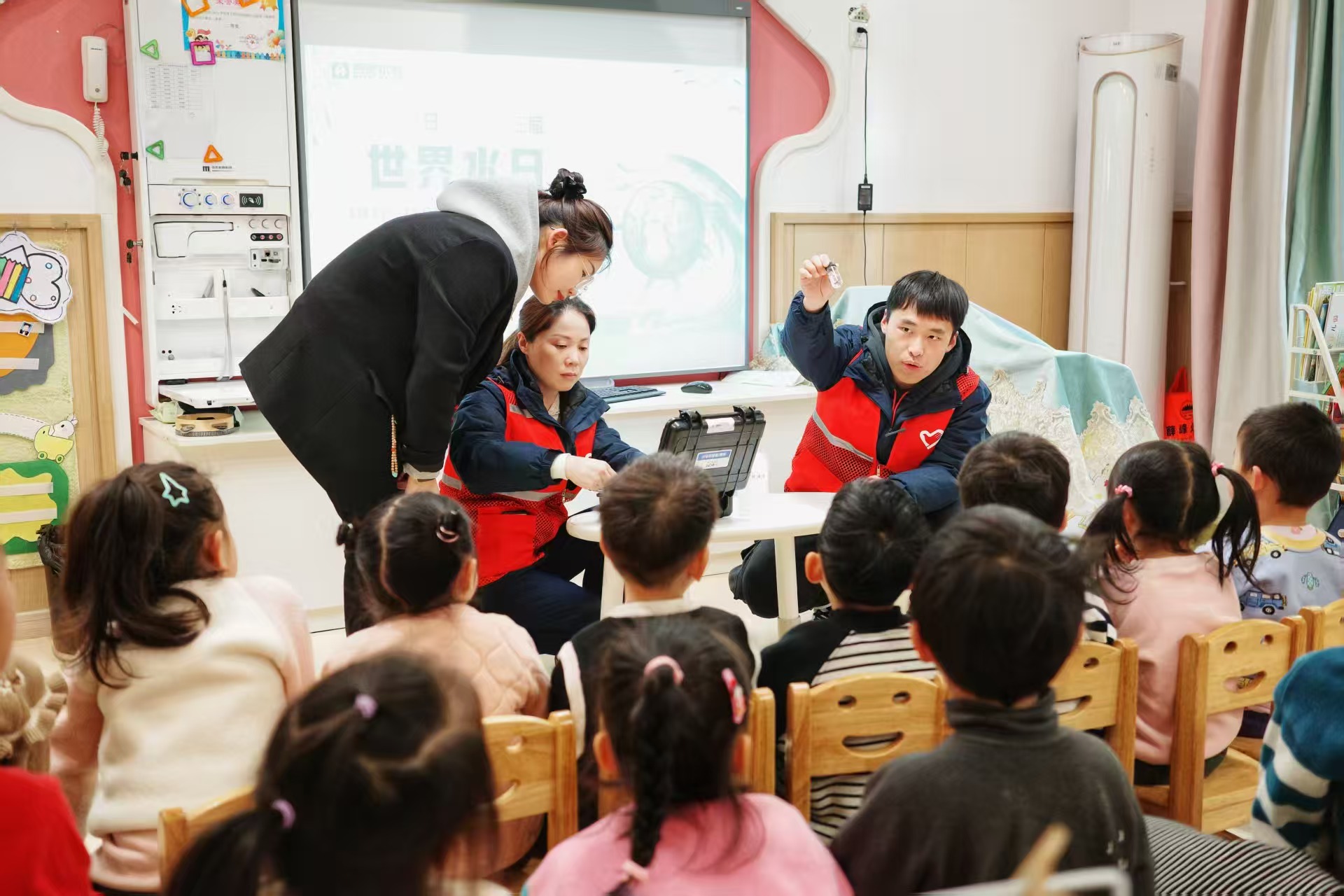 活动现场,志愿者们精心准备了用水知识小课堂。他们用生动有趣的语言,结合精美的PPT和动画短片“小小一杯水能创造很多故事”“小水滴的升华”,为孩子们详细讲解了水的循环过程、水资源的珍贵以及节约用水的必要性。孩子们听得津津有味,积极举手回答问题,现场气氛热烈。通过小课堂,孩子们了解到水的重要性、制水生产过程以及家庭节水小窍门,帮助儿童养成节约用水的好习惯。