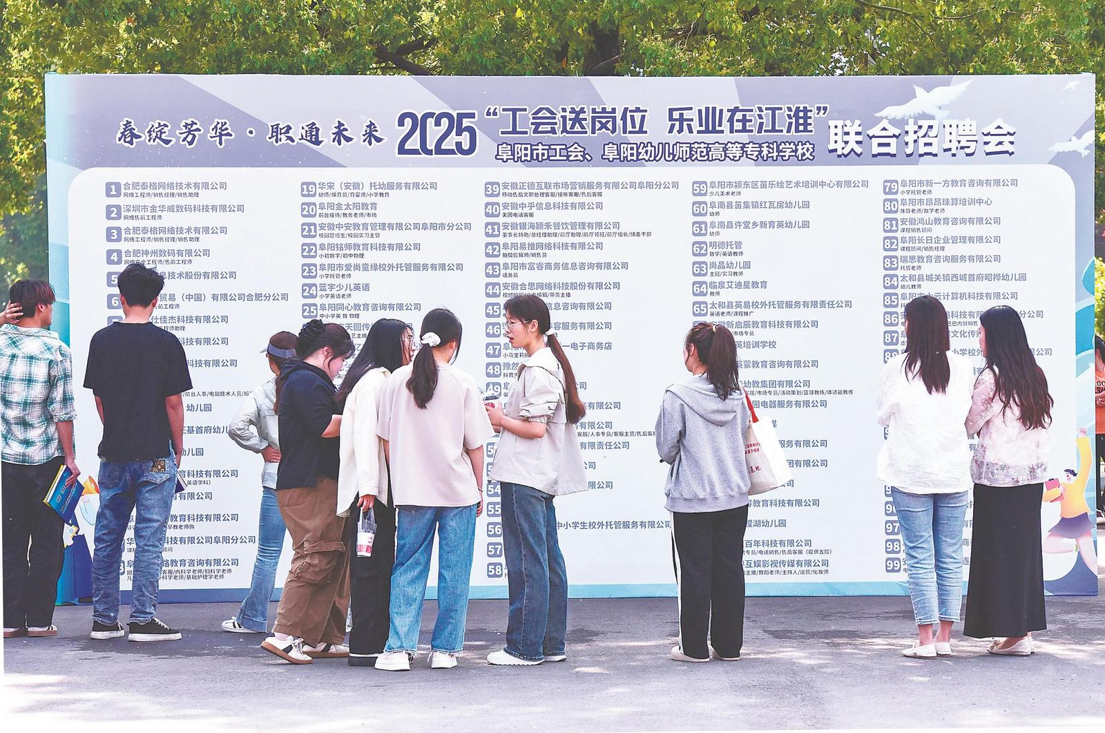 近日,阜阳市工会、阜阳幼儿师范高等专科学校联合举行招聘会,近百家用人单位提供3000余个岗位,吸引众多应届毕业生前来应聘。通讯员 卢启建 摄