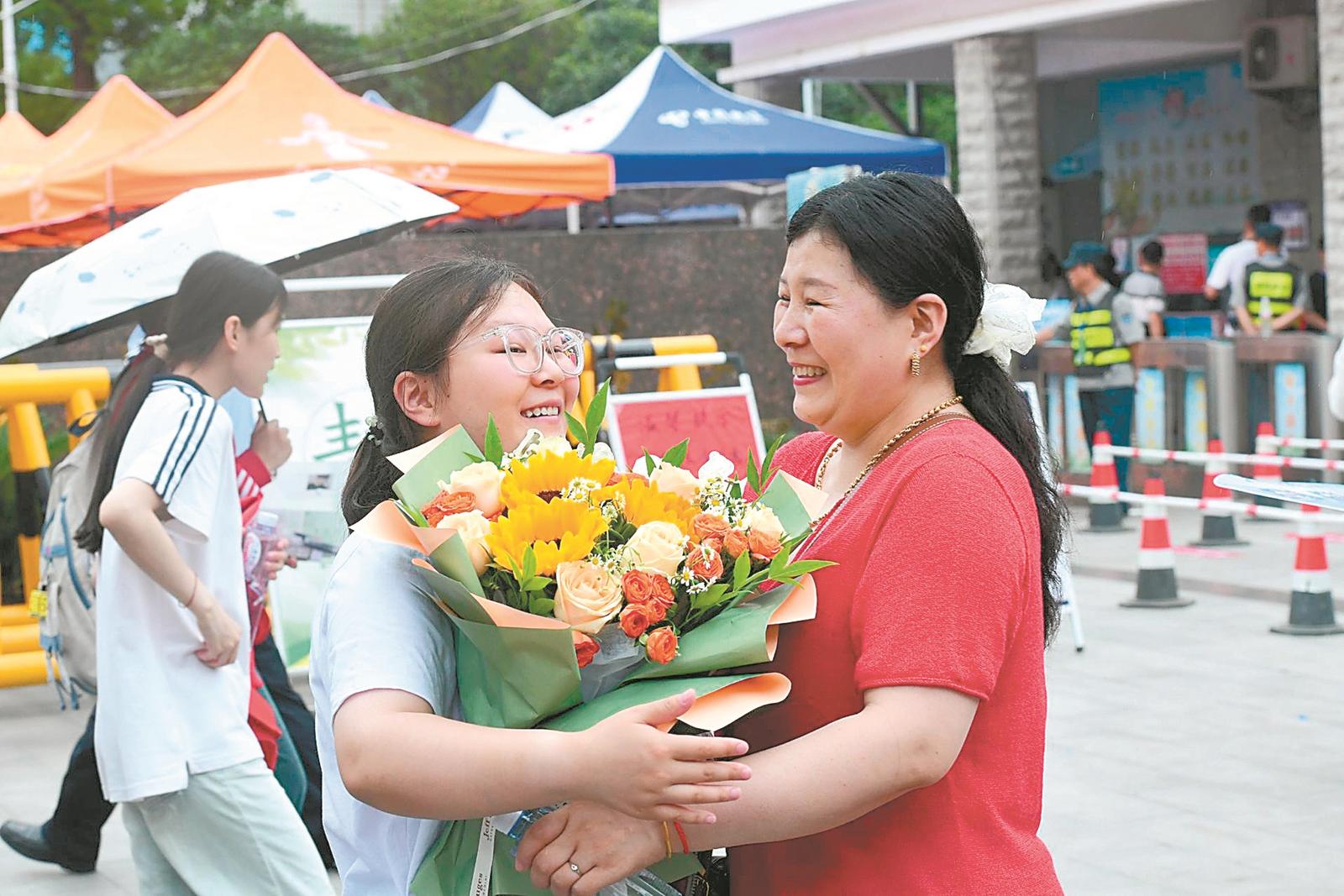 6月7日,阜阳市第二中学考点,结束首场考试的一名考生收到妈妈送来的鲜花。考点内,考生们为梦想“作答”;考点外,家长为考生加油。(安徽日报 特约摄影 王彪 摄)