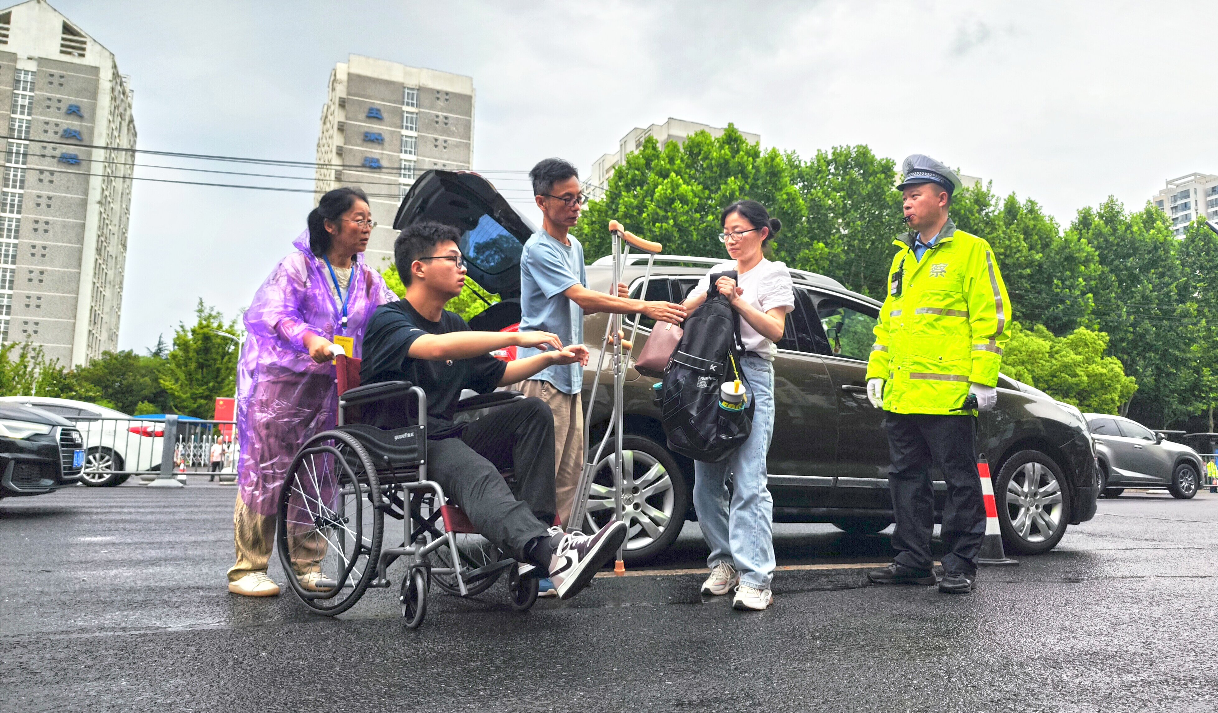 6月7日,在合肥一中考点外,志愿者在考场外迎接腿部受伤的考生。(中安在线 记者 刘玉才 通讯员 马二虎 摄)